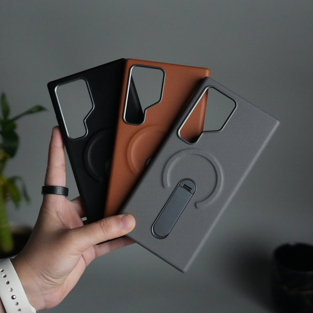 Galaxy S25 Ultra Premium Leather-Texture Back Case with Metal Kickstand | Shockproof Cover